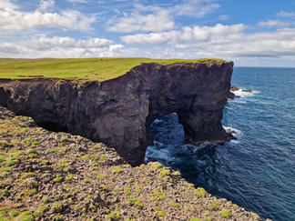 Nedaleko majáku na Eshaness se nachází i další geologická zajímavost, ostrov Dore Holm, který z určitého úhlu vypadá jako slon. Přejíždíme nad kamenitou zátoku, která ve 20. století sloužila jako rybářská základna, odkud odplouvaly tradiční lodě sixareen za hluboko mořským rybolovem a jdeme se projít.