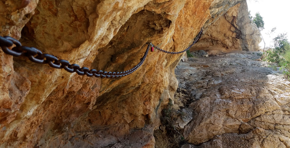 Opět s nadšením vzdychám a pomalu začínám klesat ze sedla směrem do dalšího úzkého vápencového kaňonu. Konečně stín. Dávám si pauzičku a potkávám další turisty, co se rozhodli překonat celou GR 221. Procházím okolo skalních výchozů a dostávám se do pasáže s ocelovými lany. Nečekejte žádné lezení. Jen malé přidržení a už jsem zase na široké cestě.