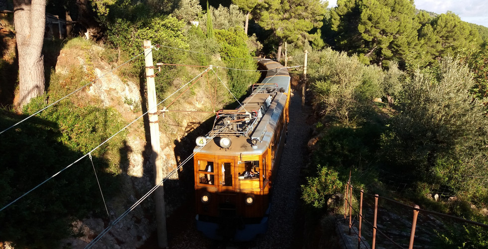Dostáváme se k železnici a chytáme první sluneční paprsky. Krajina se pomalu probouzí. Přes solární nabíječku nabíjíme mobily. Snídáme. Pod námi akorát projíždí historický vlak z Palmy do Port de Sóller. Fotíme a máváme.