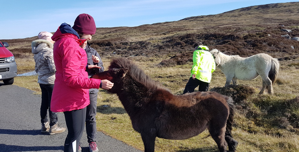 14. 5. – úterý: Máme před sebou poslední hebridský den a venku opět svítí sluníčko! Je pravda, že v květnu bývá ve Skotsku nejlepší počasí, že ale budeme mít celých deset dní sluníčko, to asi nikdo z nás nečekal. Vstáváme v 7:00 a po snídani šampionů (vejcích se slaninou) přejíždíme na ostrov Jižní Uist. U jezera Loch Druidibeg odbočujeme z hlavní silnice a brzy se už dostáváme do oblasti s volně se pasoucími shetlandskými poníky. Jsou to ňuňánci, kteří přesně vědí, jak vylákat z turistů co nejvíc dobrot.