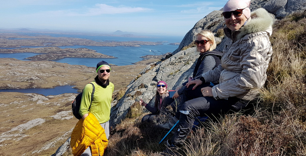 Na vrcholu Beinn Scalabhat (481 m) jsme až za čtyři hodiny. Je krásně. Na jihu pozorujeme pohoří Jižního Uist a na severu jezerní krajinu ostrova Benbecula. Na východě se z moře zvedají jasné obrysy ostrova Isle of Skye a na západním horizontu vykukují ostrovy St. Kilda.