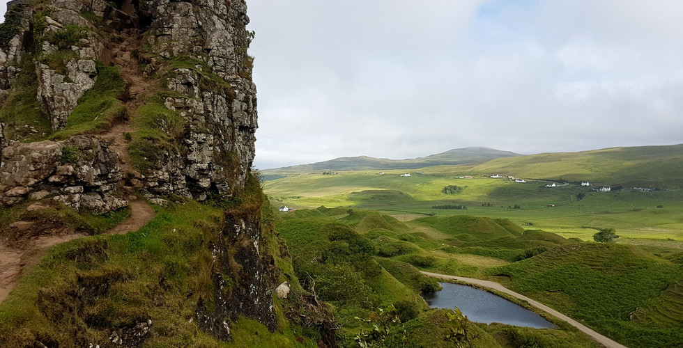 Vychutnáváme si červnové sluníčko, a potom se už vracíme do auta. Předpověď počasí se ani dnes nemýlila: ráno zataženo a mrholení, odpoledne slunce. Přejíždíme zpět do Quiraing, místa, které mám na Isle of Skye asi nejradši. Svítí slunce. Místní zelené pohoří snad nemůže být zelenější. Procházíme se okolo skalních výchozů a hluboko pod námi pozorujeme rašelinová políčka.