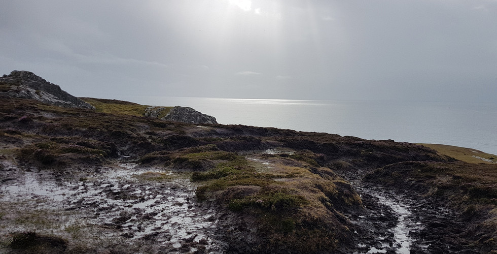 Počasí je stále ještě famózní. I tak ale raději oblékáme nepromokavé bundy a návleky. Bílou písečnou pláž i nádherné louky necháváme za zády. Otevíráme branku a dostáváme se na úzkou kamennou pěšinku směřující okolo pobřeží vzhůru. Před námi se objevuje pohled na jezera Loch na Cleabhaig a Loch a´Ghlinne.