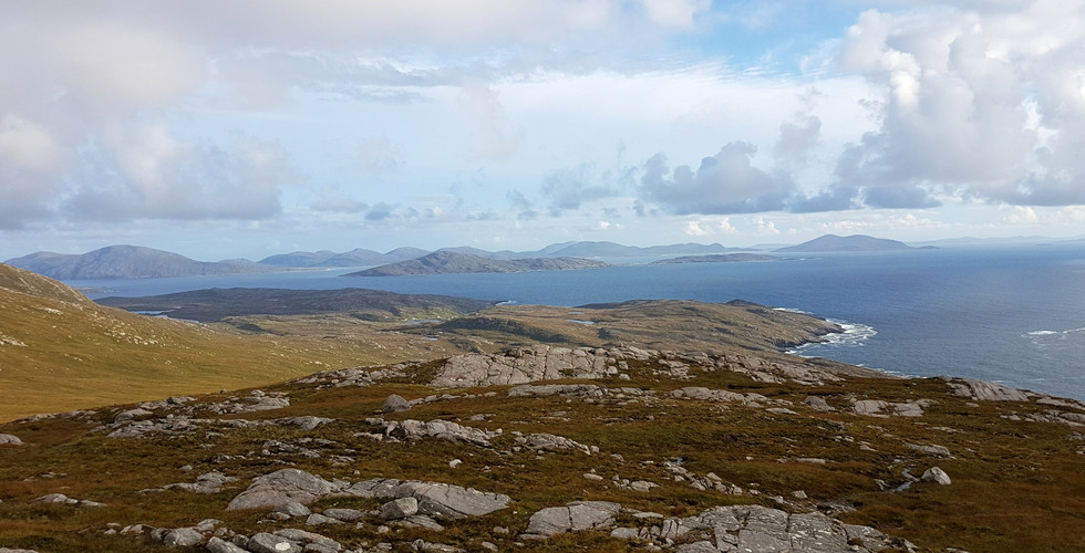 Scházíme k bílé pláži Tráigh Mheilein. Je odliv a na obrovské pláži jsme úplně sami! V dálce vidíme divoké hory severního Harrisu a vlevo od nás ostrov An Sgarp. Na konci pláže přicházíme ke kamenité části. Nachází se zde zeleno-červeno-bílé kamínky lewisianů. Sbíráme menší úštěpky, a pak pokračujeme po zelených loukách až do sedla nad Loch a´Ghlinne. Stoupáme stále vzhůru. Holky jsou statečné. Hlavně Ilonka, která má strach z výšky. Po půlhodině šplhání přicházíme na vrchol Huiseabhal Beag 306 m. Podvečerní slunce halí okolní krajinu do neskutečných barev!