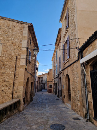 Z autobusu pozorujeme rovinatou krajinu políček s kamennými větrnými mlýny, které už dávno neslouží a vlevo nás vítá hradba pohoří Serra de Tramuntana. Kamenitá políčka pravidelně střídají sady a vinice a za necelou hodinu vystupujeme v centru Pollency.