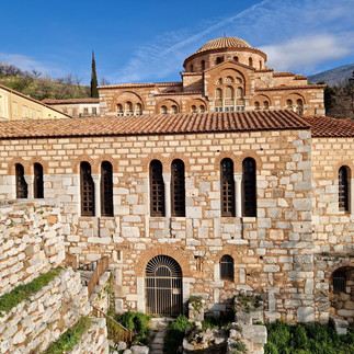 1. 3. sobota: I dnešní den je pořádně nabytý. Z malé vesničky odjíždíme už v 8:00. Projíždíme po úzké asfaltce mezi horami. Nikde nikdo. Okolo silnice se sem tam objeví zapomenutý sníh, a pak už sjíždíme přes menší i větší vesničky do údolí, kde na malém návrší ční komplex budov z 11. století. Naší první zastávkou je klášter Hosios Loukas, který je od roku 1990 zapsán na seznamu UNESCO.