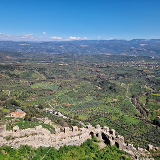 Auto necháváme na spodním parkovišti. Obrovským komplexem procházíme ve směru hodinových ručiček. Od pokladny, kde platíme 6 euro za vstup, jdeme doleva a postupně stoupáme úzkými kamennými uličkami vzhůru. Brzy přicházíme k prvnímu z mnoha zachovalých kostelů. Nejkrásnější pohled na okolní hory i celý městský komplex máme ale až z hradního opevnění, které se nachází v nejvyšším bodě areálu. Svačíme a vychutnáváme si pohledy na částečně zasněžené pohoří Taugetos (1690 m n. m.).
